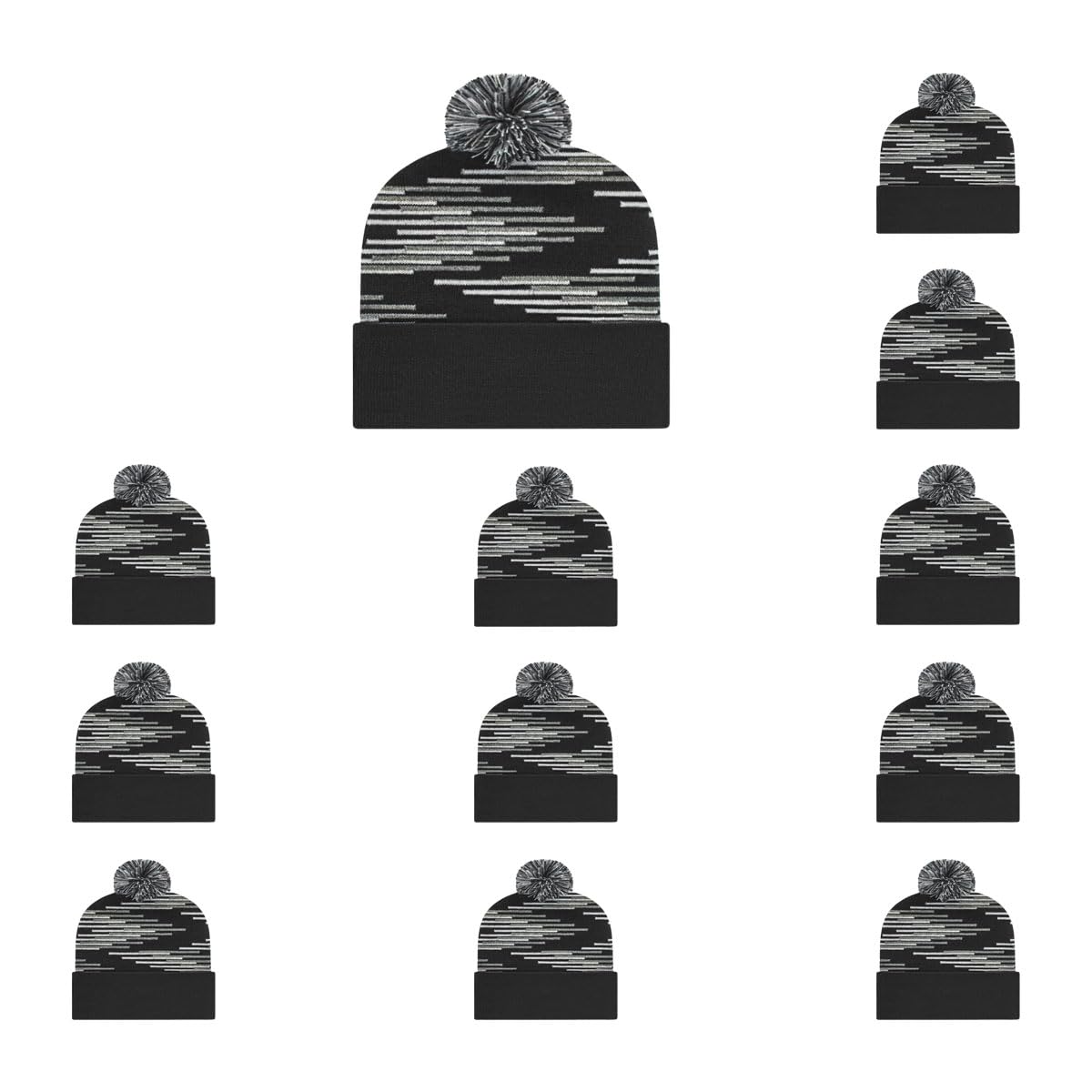 Add warmth and style to your winter look with this acrylic/nylon/spandex blend knit cap with cuff. Designed for both comfort and visual appeal, it features a staggered bar pattern throughout the crown and a solid color cuff topped with a matching three-color pom for a modern, sporty finish.