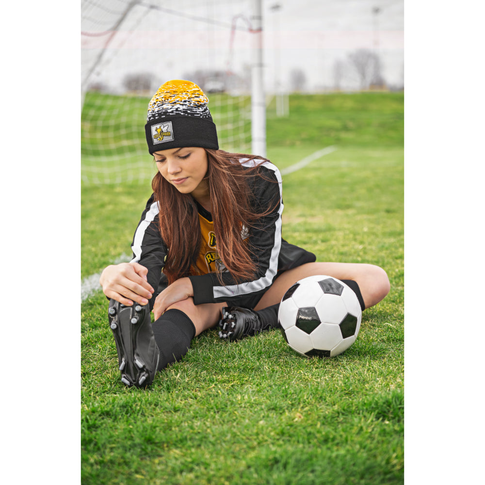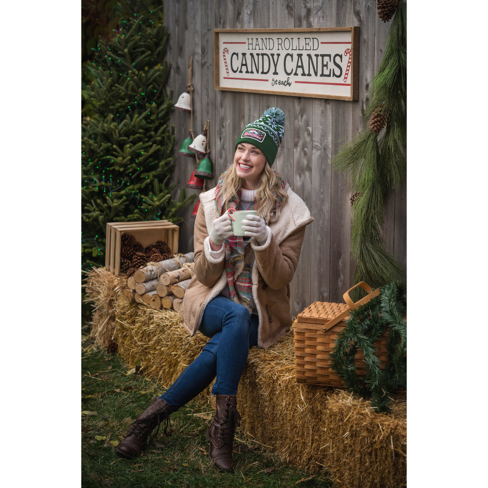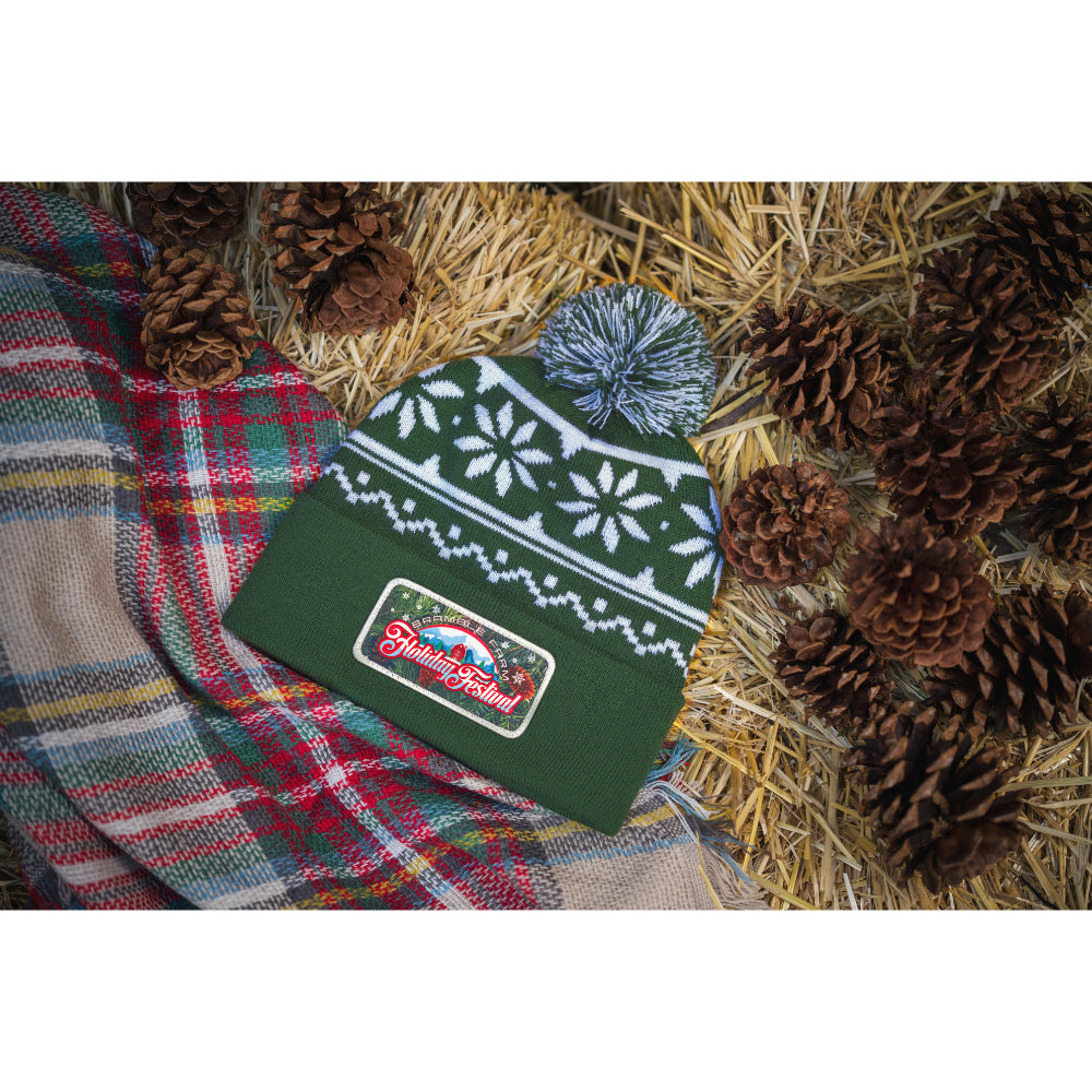 Stay warm in style with this acrylic/nylon/spandex blend knit cap with cuff. Featuring a snowflake pattern throughout the crown and a solid color cuff topped with a two-color pom, this beanie is perfect for winter fashion and outdoor activities.